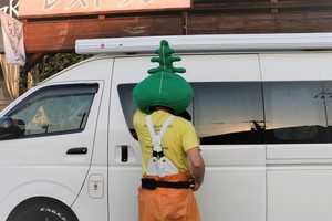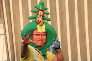 ワカメのかぶり物、黄色のTシャツ、